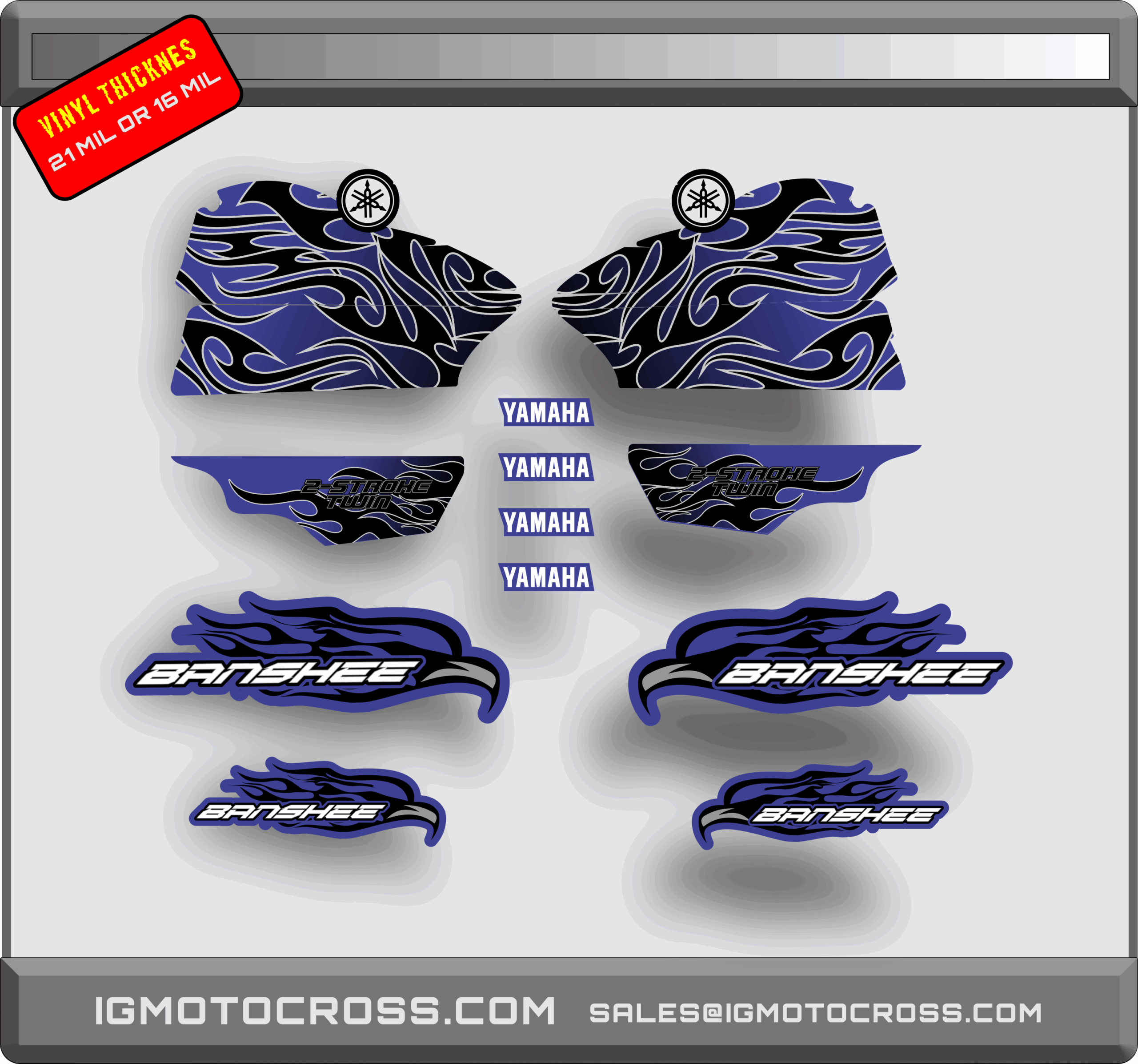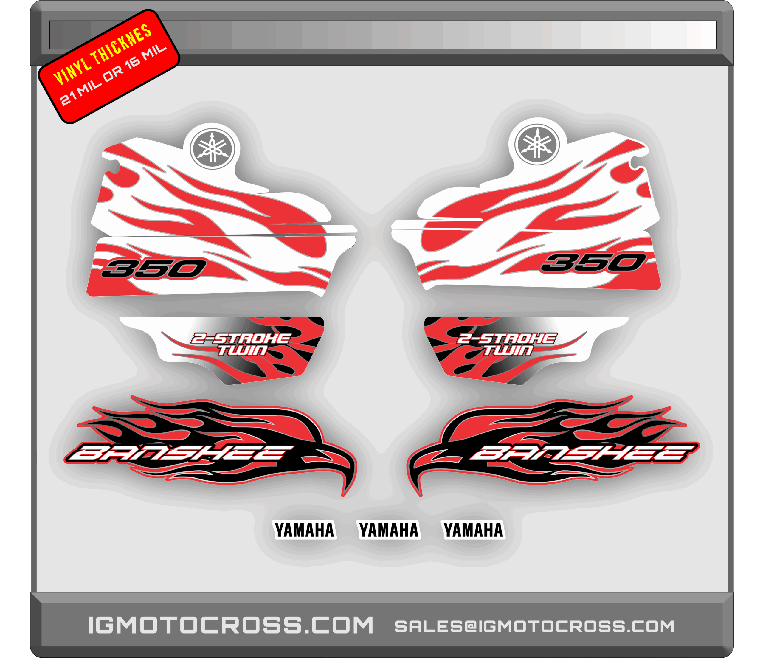 Yamaha Banshee graphics kit printed with state of the art 1440 resolution print process,printed in high quality HIGH TACK WITH FLO TO GET OUT BUBBLES vinyl designed for motocross and atv vehicules and laminated with thick clear vinyl for a thickness of 16 mil ( triple or more thickness than oem) 21mil available at $89.00. Our graphics are processed the same day of payment cleared and shipped the next day via priority mail for free to USA,PR and Hawaii. if you need something custom contact us via email.