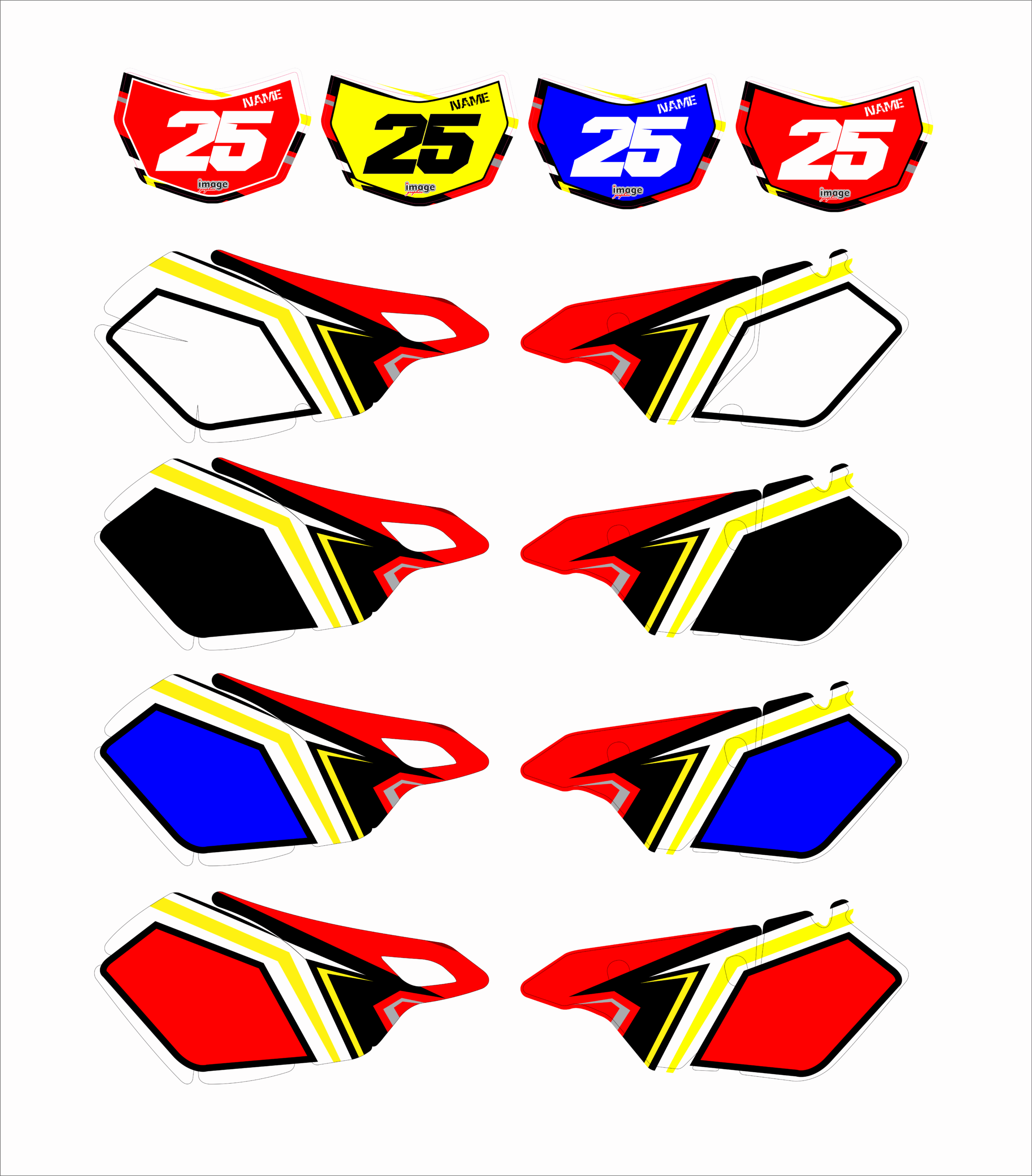 THIS GRAPHICS Kits are already designed and ready for you to put your own twist on them. While the design itself cannot be changed, you can totally make your kit stand apart from the rest by changing any or all colors and fades on any part of the kit. You can also add your sponsor logos wherever you choose (some logos may be prohibited due to licensing rights.)