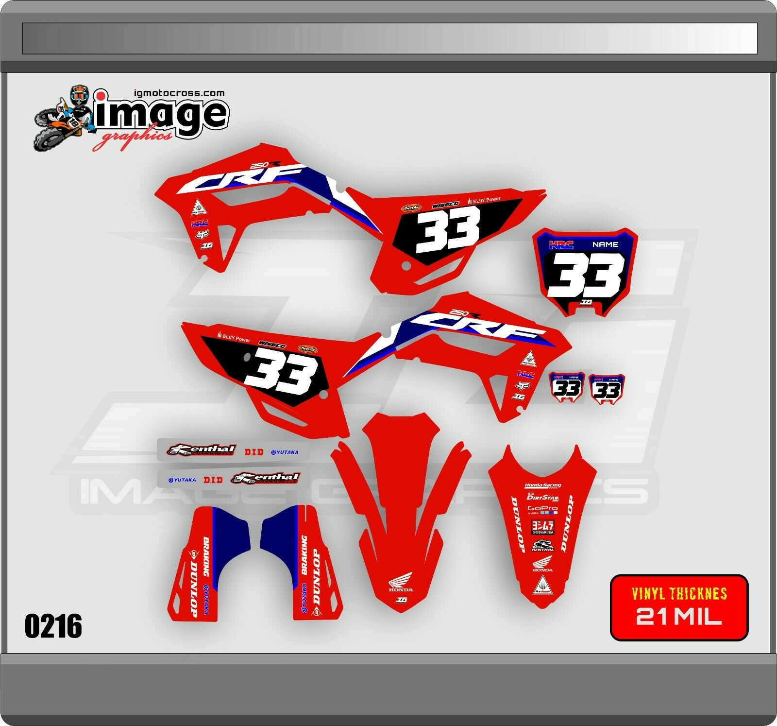 HIGH QUALITY SEMI CUSTOM GRAPHICS FOR HONDA CRF 250 2022 THIS KIT INCLUDE GRAPHICS FOR FRONT FENDER, REAR FENDER, SHROUDS,NUMBER PLATE,SIDE PANELS, FORK SLIDER,SWINGARM AND 2 MINI NUMBER PLATES. YOU CAN CHANGE NUMBERS,NAME AND . PRINTED IN MX SPECIFIC VINYL 21 MIL LAMINATED WITH THICK HIGH GLOSS CLEAR.